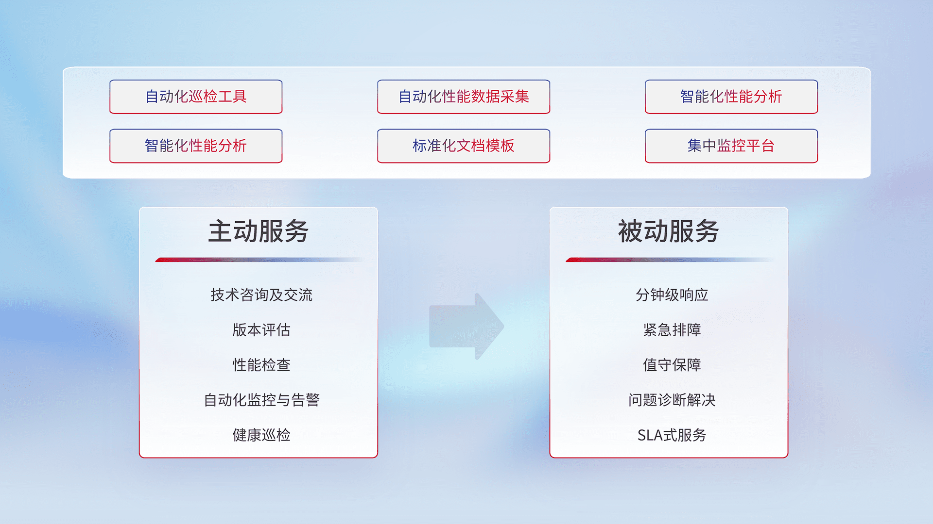 智能化工具和标准化文档,,,,保障服务质量,,提供主动服务(包含技术咨询、、版本评估、、性能检查、、自动化监控与告警、、、健康巡检)和被动服务包含(分钟级响应、、、紧急排障、、、值守保障、、、问题诊断解决、、SLA服务)。。。。